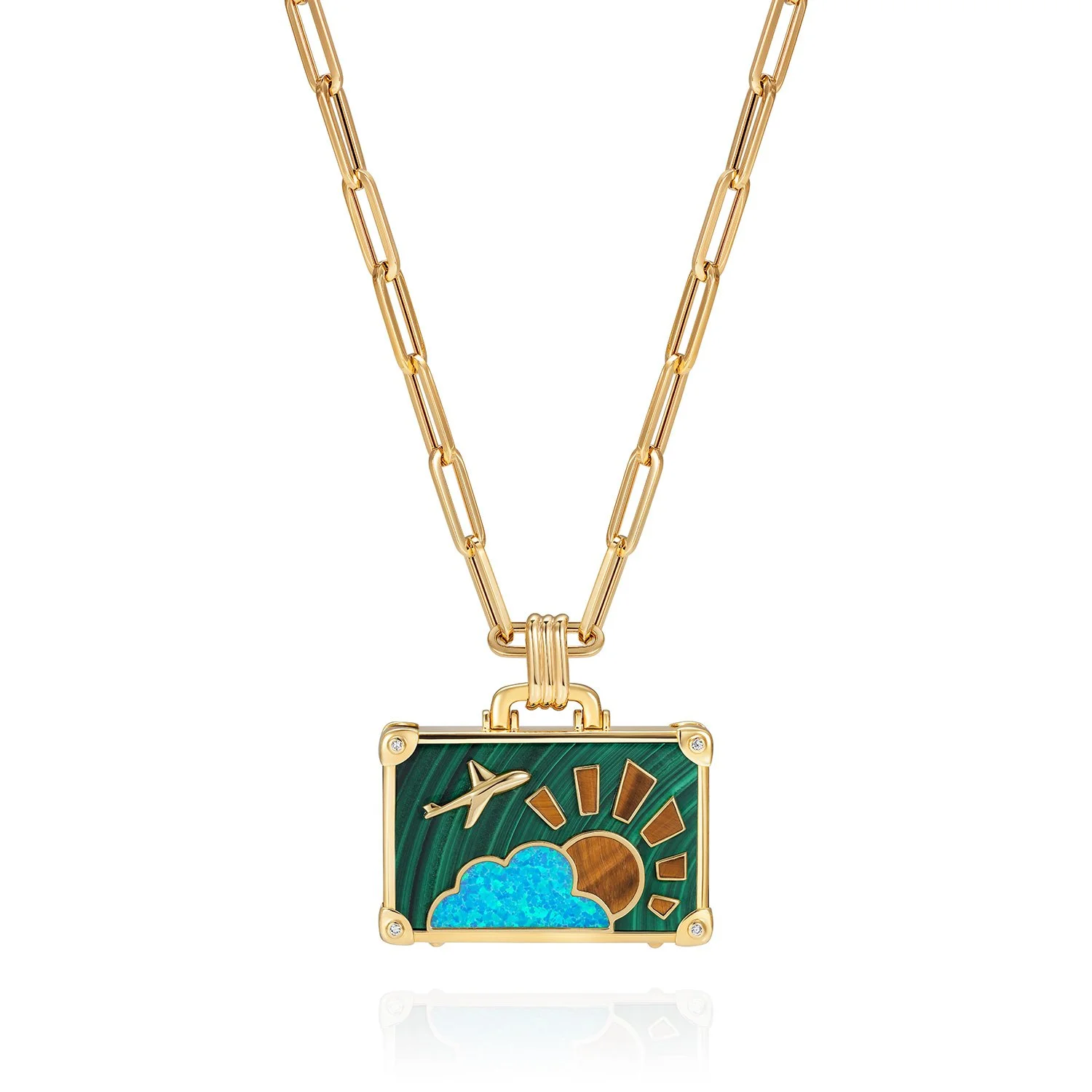 NeverNot is a brand that never shies away from color or whimsy. London based, by way of Georgia founders Nina Dzhokhadze and Natia Chkhartishvili wanted to create pieces that can and should always be worn. “Their jewels are a joyful symbol of escape” and their latest travel collection that consists of enamel, diamond and gem suitcase and sunglass pendants is a shining example of that statement.