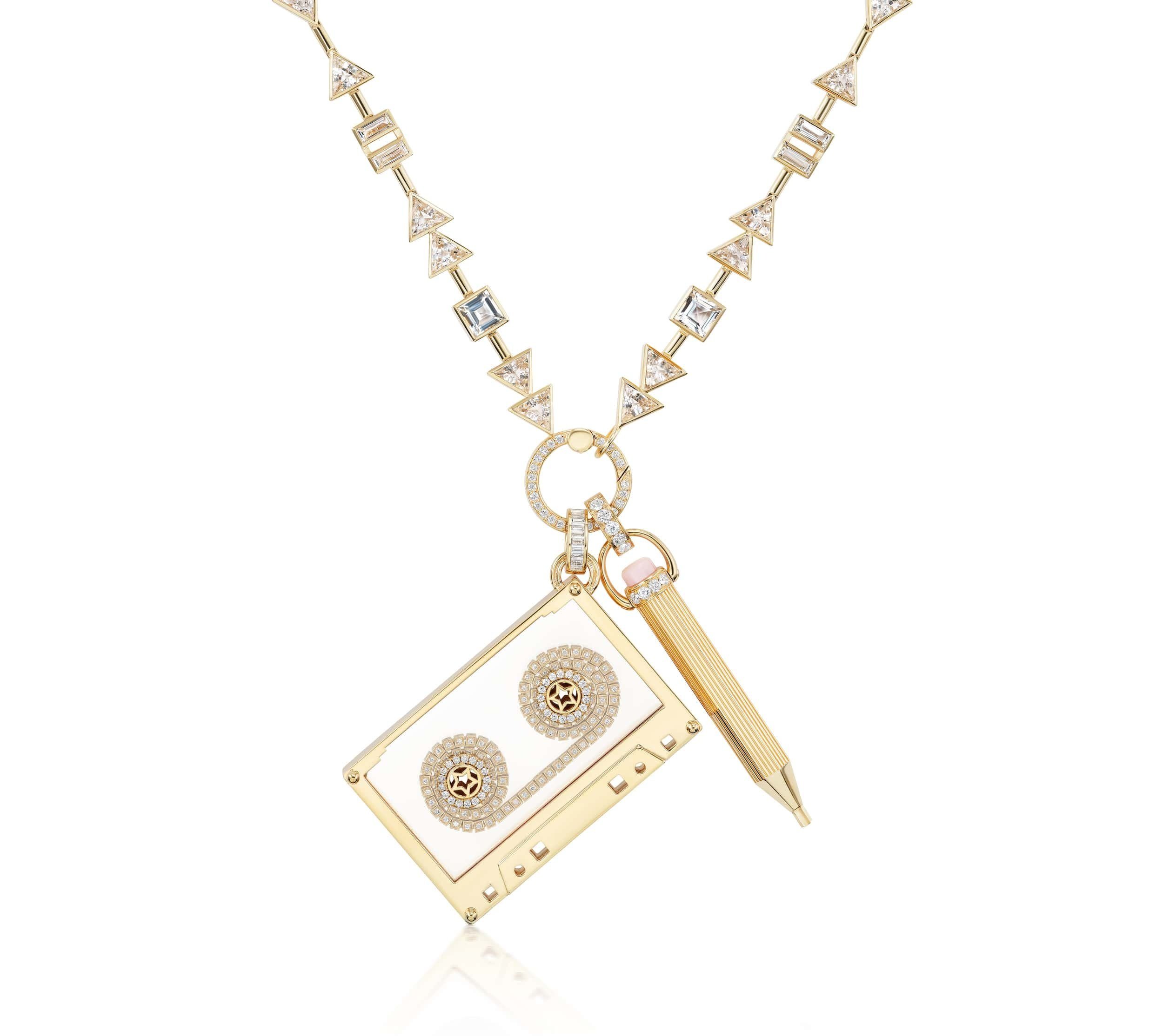 New York-based brand Sorellina was founded by sisters Nicole and Kim Carosella. Feminine and fun are two words that best describe the brand. Last year they were recognized with the Best in Platinum award and this year for their eclectic creativity with Best in Innovative. The collections are often strong on themes and with the launch of “Play List,” it was fitting to create a luxe throwback 18k yellow gold cassette pendant that has moving diamonds when you rewind or fast-forward with the gold pencil charm.
