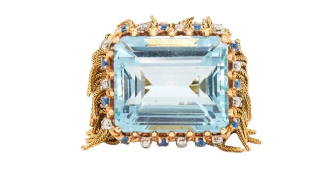18k yellow gold, emerald cut aquamarine, diamonds and sapphires “Aquamarine Fringe” ring, $22,500 at Fred Leighton