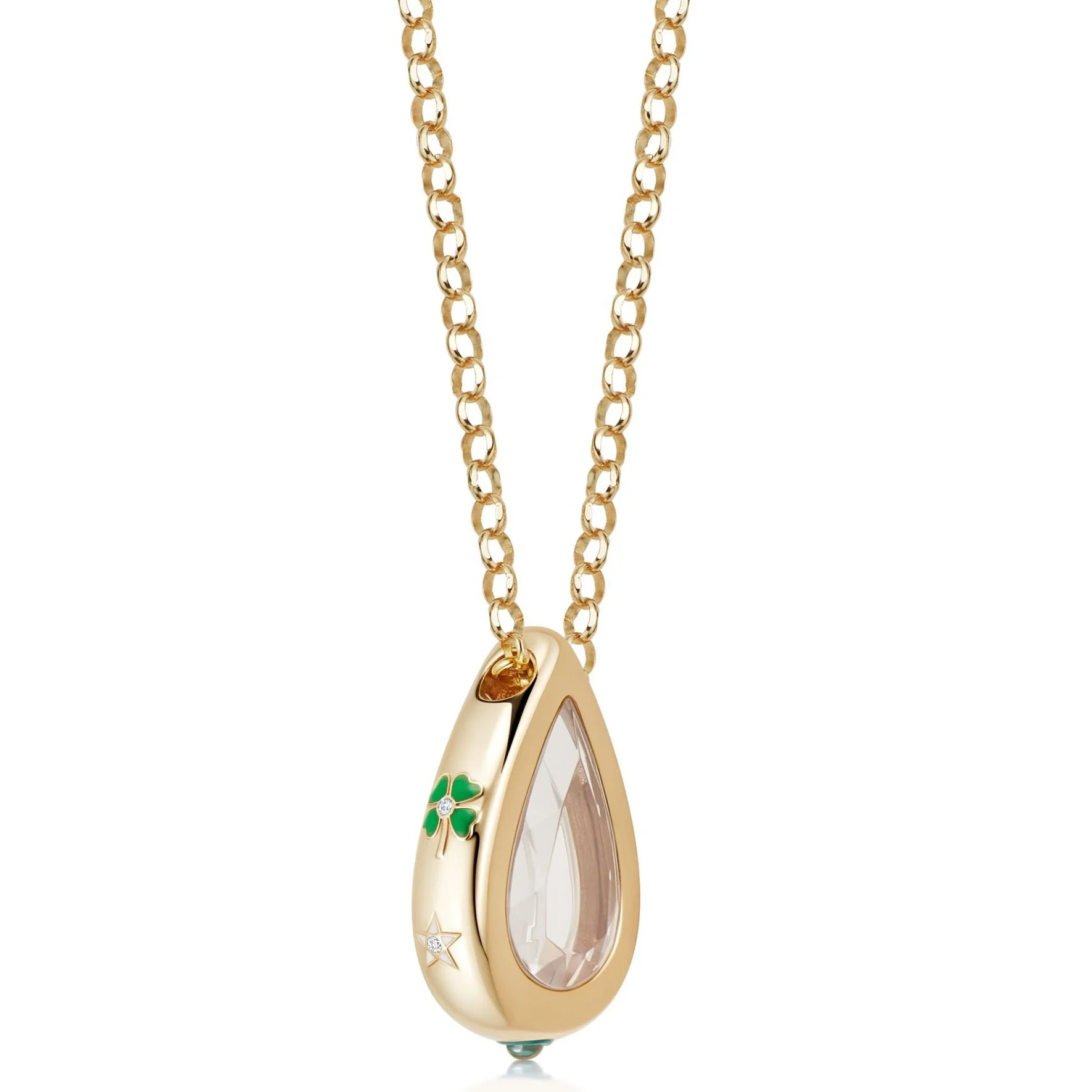 English brand Loquet was created by Sheherazade Goldsmith and Laura Bailey who wanted to create their modern version of sentimental lockets. This pendant not only allows you to fill the crystal with visible customizable “lucky” charms but adds even more luck with an enamel heart, star, and of course a green four-leaf clover.