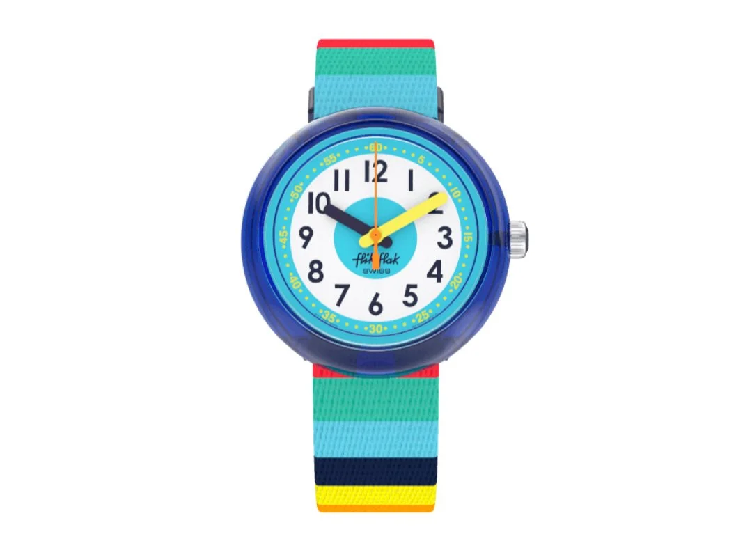 Since 1987, Flik Flak, Swatch's younger brand, has aimed to teach kids how to tell time (the old-fashioned way) with lively watch styles. This gender-neutral, rainbow-colored watch is our pick for your kiddos first watch. Bonus: personalization.
