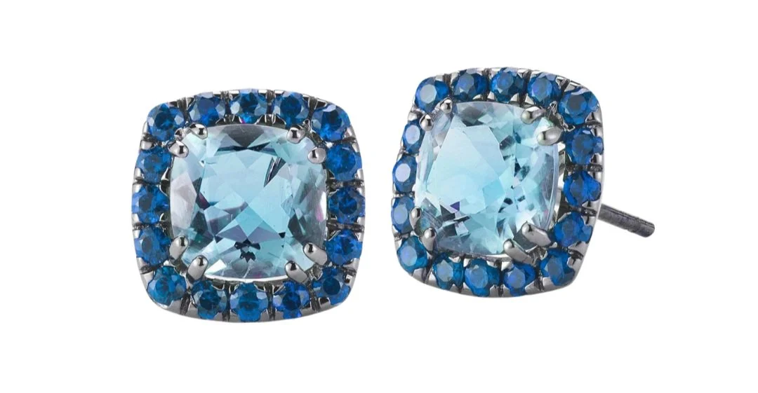 A & Furst “Dynamite” stud earrings in 18k white gold with blue topaz and sapphires, $2,740 at Zadok Jewelers